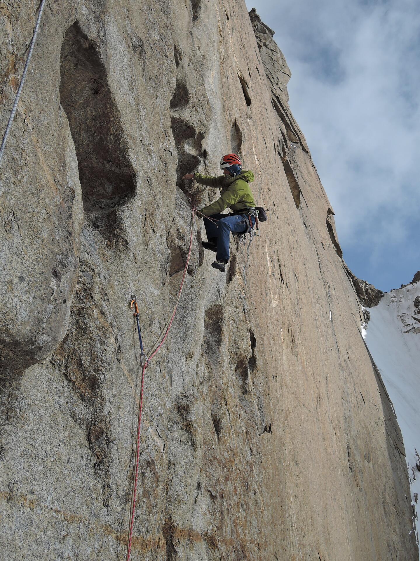 6. Augusta sme konečne začali liezť prvé dlžky v 70° ľade ktorým sme sa dostali pod skalu. Ďalšie dni sme strávili prebíjaním jednotlivých dĺžok ktoré sa ukázali byť dosť ťažké. Náš pobyt v stene komplikovalo počasie. Skoro každý deň snežilo a teploty sa pri lezení pohybovali oko 0 °C. Za 20 dní čo sme strávili v stene boli len 2 jasné dni. Teplota v noci klesala na -10 °C