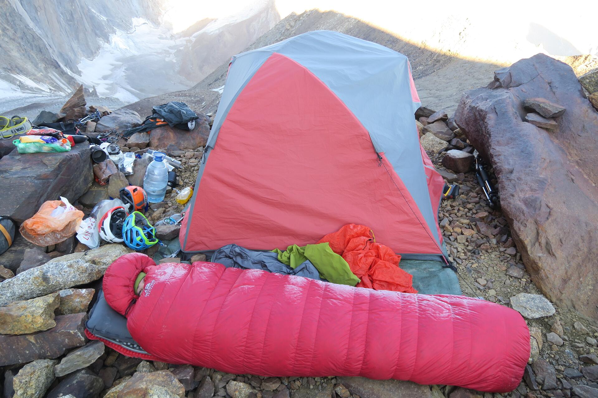 Na 7. štand sme vytiahli portaledge a to výrazne zjednodušilo náš postup. Bola to moja prvá skúsenosť so spaním v tomto vynáleze. S Vladom sme v noci mali tak na 2 – 3 hodinky zábavu kým sa nám portaledge podarila zavesiť. V tme, zime a vo vetre to nebolo také jednoduché ako pri nácviku na zemi. Ďaľšie dni sa pokračovalo v lezení aj počas sneženia. Jedna dvojica liezla a druhá dvojica bola dole v campe 3. aby bol vždy aspoň niekto čerstvý a zohriaty. Približne v 2/3 steny sme boli nútený sa všetci presunúť kvôli počasiu až do základného tábora kde sme sa konečne dali trocha dohromady.