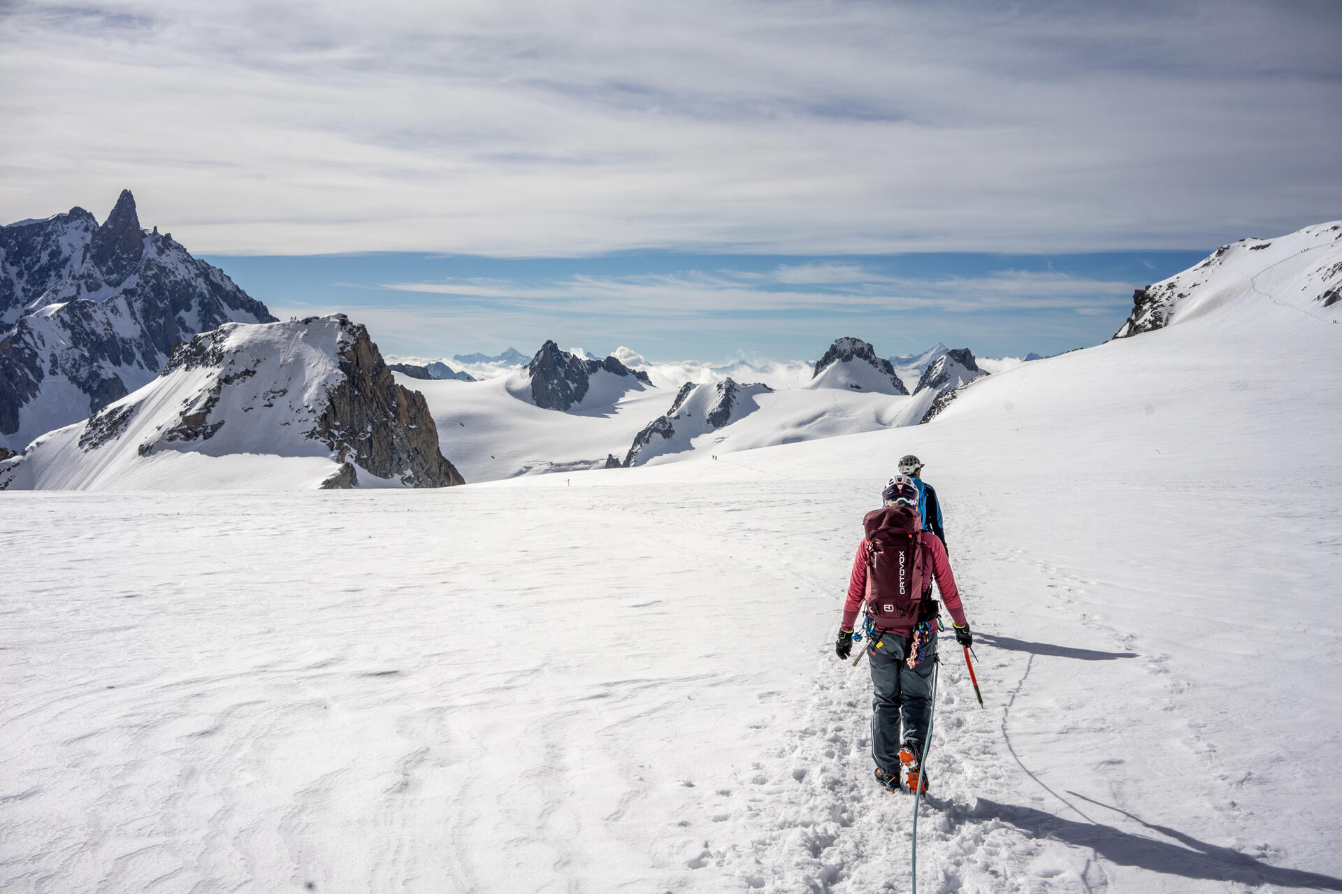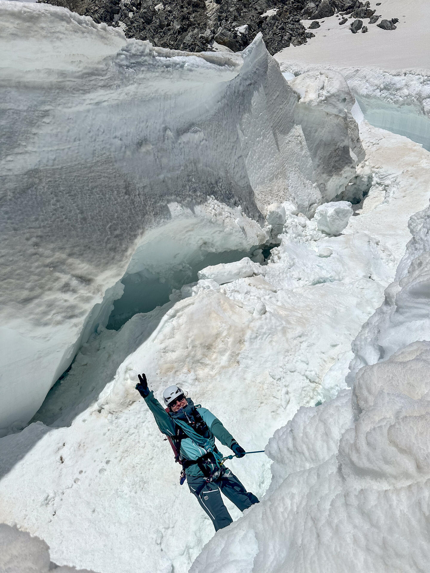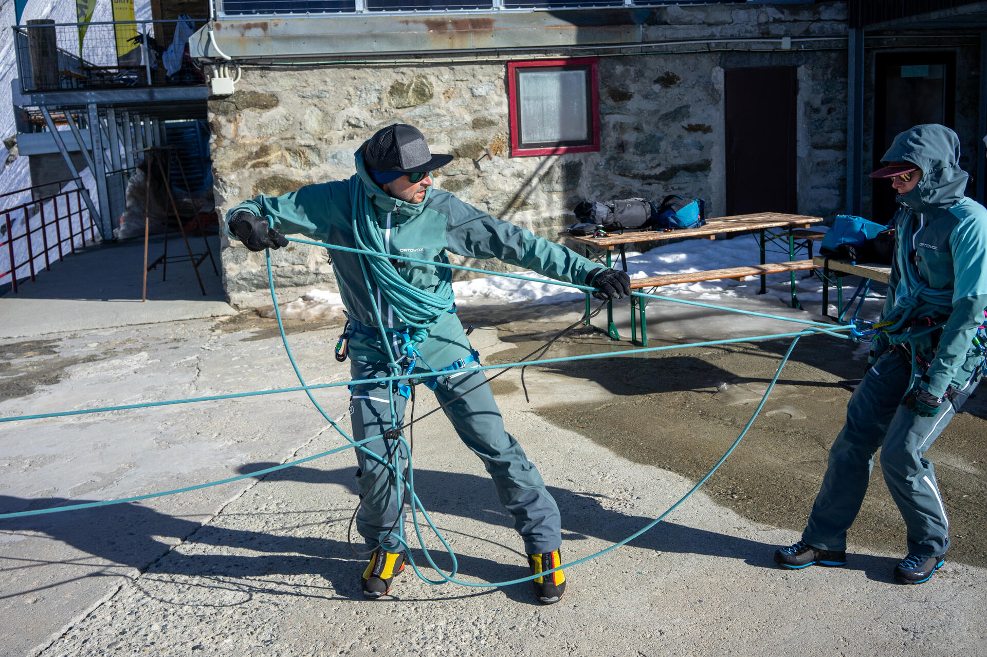 Konečně! Ta pravá horská túra! Přechod po ledovci, ve kterém jsou stovky trhlin je obavou každého horolezce i horského vůdce. Schopnost se správně navázat na lano, rozdělit tým a vybírat co nejbezpečnější trasu by mělo patřit mezi vaše elementární dovednosti a znalosti. Na samotném hřebeni Entrèves jsme trénovali práci s lanem – tzv. krátké lano a short pitching a došlo i na několik slaňování a spouštění.