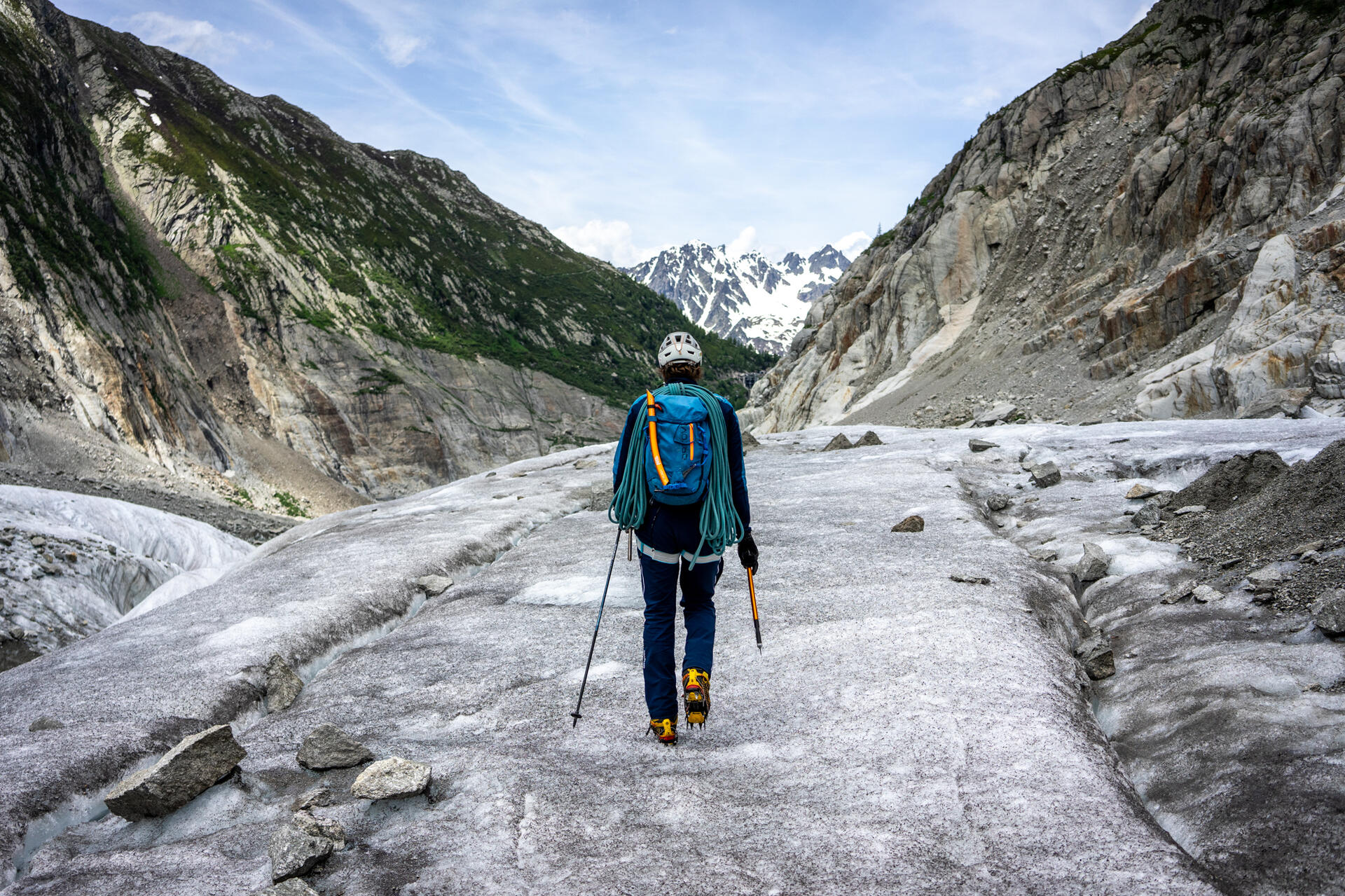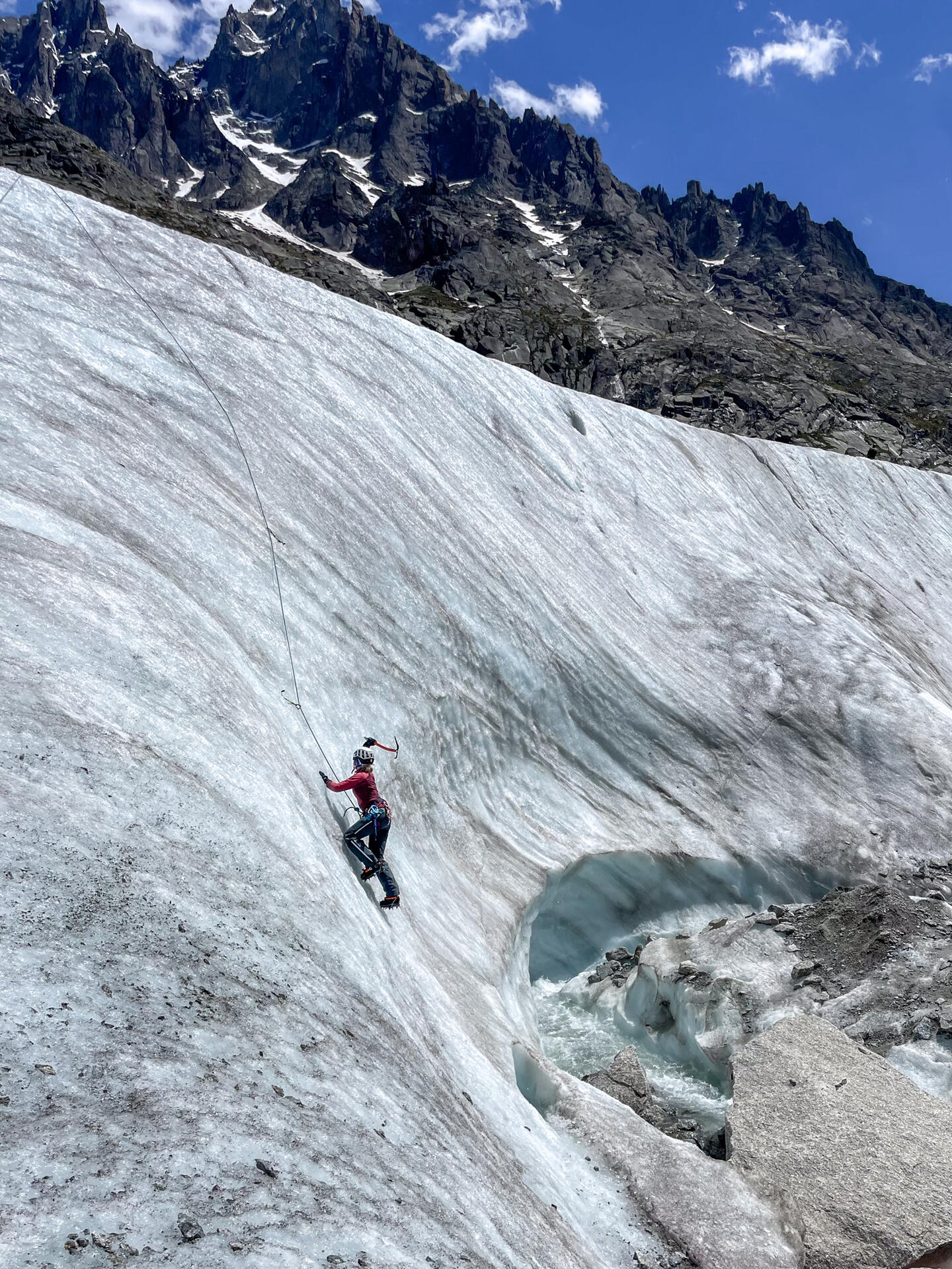 Vysvětluje nám Honzány při kávě na moderní chatě Montenvers, která leží hned vedle ustupujícího ledovce Mer de Glace. Na něm jsme následně strávili celý první den podobně jako desítky dalších lidí a to nacvičováním pohybu na mačkách, používáním cepínu nebo i vrtáním šroubů do ledu, výrobou abalakových hodin a i trochu perfektního ledolezení – ano v červnu :).