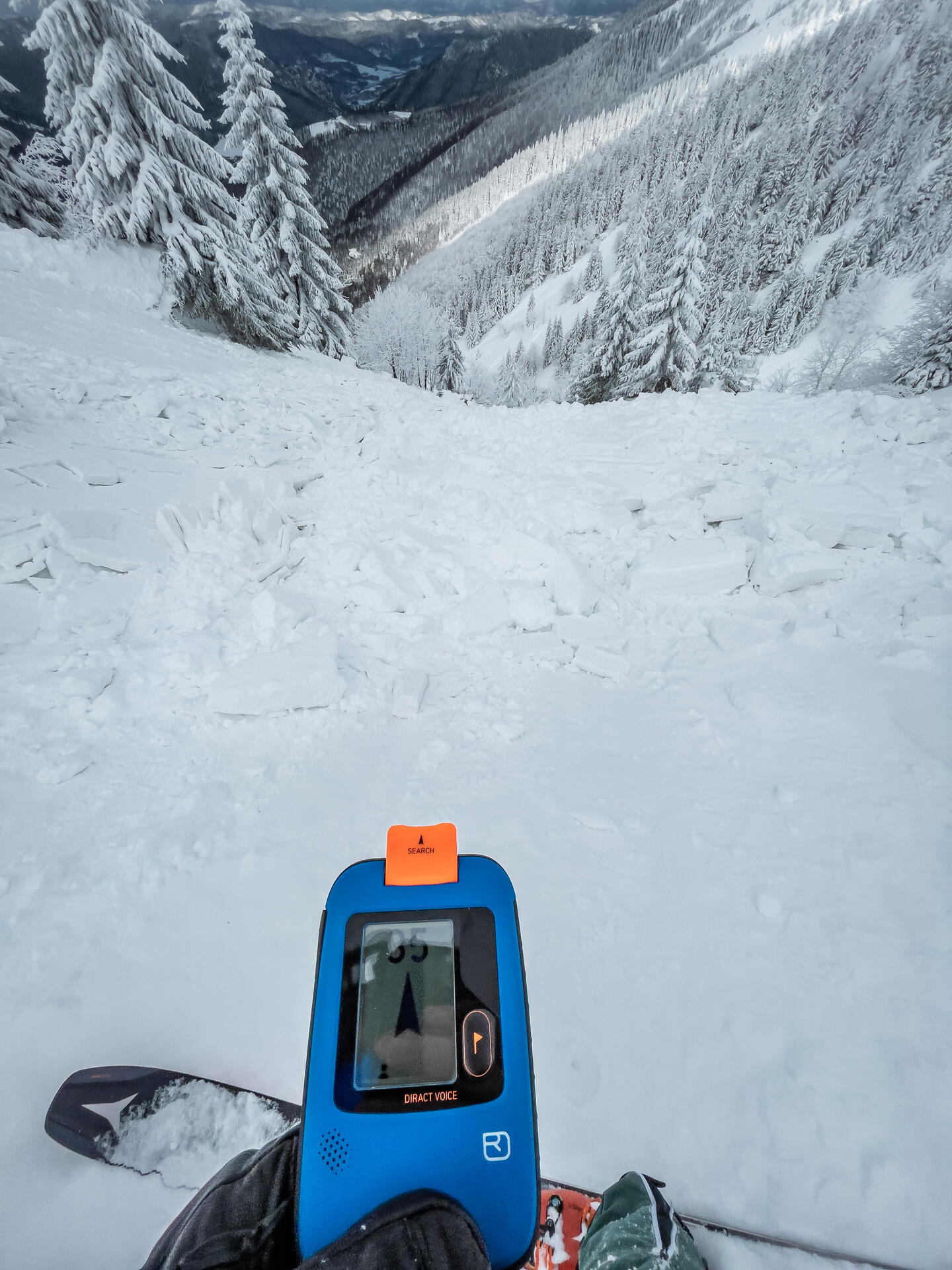 - O malý moment sa za mnou objaví parťák, ktorý držal bezpečný odstup. Začíname s kontrolou lavinišťa pre prípad, že za nami vystupovala druhá dvojica. Lavínová dráha totiž strhla aj časť našej výstupovej stopy. Nič nenachádzame, rýchlo dokumentujeme a čo najrýchlejšie opúštame lokalitu.