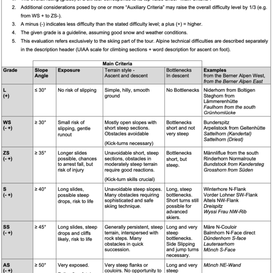 Stanovení obtížnosti skialpové túry je mnohem složitější než například u sportovního lezení. Musí se především zohlednit podmínky na túře. Povětrnostní podmínky proměnlivě ovlivňují terén a tím mění náročnost túry. Stejná trasa bude odlišná po napadnutí vlhkého sněhu než na firnu. To právě zohledňuje švýcarská stupnice SAC. Dříve byly základem pro určení stupně obtížnosti lyžařské dovednosti. Z těch vychází jak stupnice Blachére, tak i stupnice obtížnosti jednotlivých svahů podle Labandé.