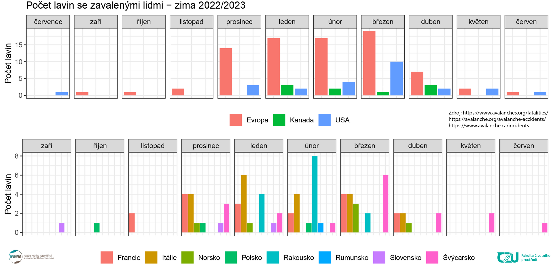 Přestože sněhu bylo většinou poskrovnu, tak laviny padaly celkem hodně a bohužel měly za následek řadu zranění i mrtvých (viz graf). V evropských pohořích dle dat Evropské lavinové služby (EAWS) zemřelo za loňskou zimu pod lavinou celkem 103 lidí. To je za posledních pět let druhé nejvyšší číslo. Vyšší počet obětí lavin byl zaznamenán jen v covidové zimě 2020/21, kdy zemřelo 129 lidí. Nejvíce obětí bylo ve Francii (25), následované Itálií (24) a Švýcarskem (23). Co se týče časového hlediska, tak většina lavin spadla od ledna do března. Na začátku února přišlo vydatné sněžení, což mělo za následek velkou lavinovou aktivitu, jak v Alpách, tak na Slovensku, nicméně pár lavin spadlo i v Krkonoších. Tragický byl především víkend 3.-5. února, kdy v Alpách zahynulo pod lavinou celkem 13 lidí. Z toho nejvíce v Rakousku (8 lidí), tři lidé v Itálii, dva ve Švýcarsku a jeden ve Francii. Většina těchto incidentů se stala při lavinovém stupni 4 a 3. Ve Švýcarsku bylo do konce března nahlášeno na SLF celkem 149 lidí uvězněných pod lavinou. Naštěstí naprostá většina z nich přežila. I v Tyrolsku byla jako na většině míst podprůměrná zima z hlediska množství sněhu a nejvíce lavinových problémů způsoboval především starý sníh. Přesto v Tyrolsku zaznamenali celkem 80 lavin s účastí osob a z toho celkem 22 lidí bylo zraněno. Jeden muž v Tyrolsku dokonce zemřel, když se snažil odklízet sníh, ale lavina ho pohřbila ve sněžném pluhu.