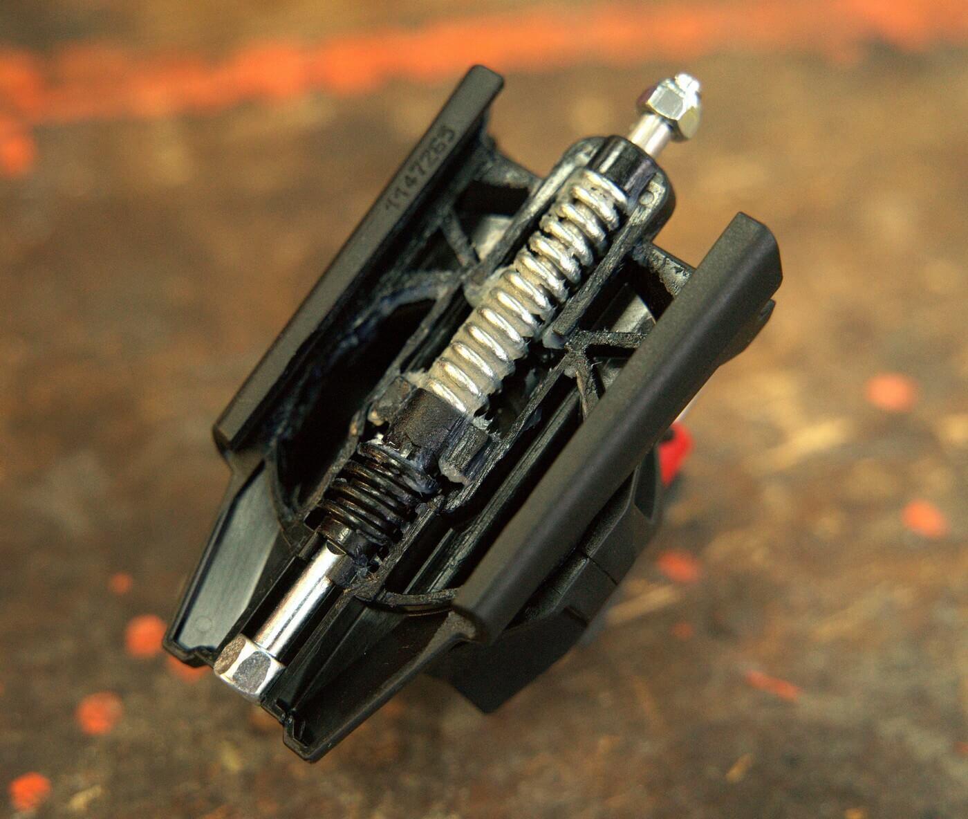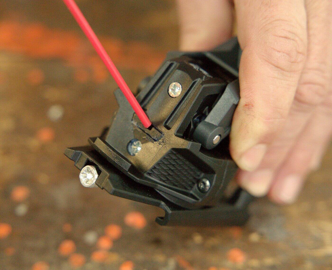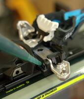 Nezapomeňte promazat i místo kontaktu brzdy se základovou deskou patky. Cílem je hladké vyklouznutí brzdy z drážky poté, co bota opustí vázání.