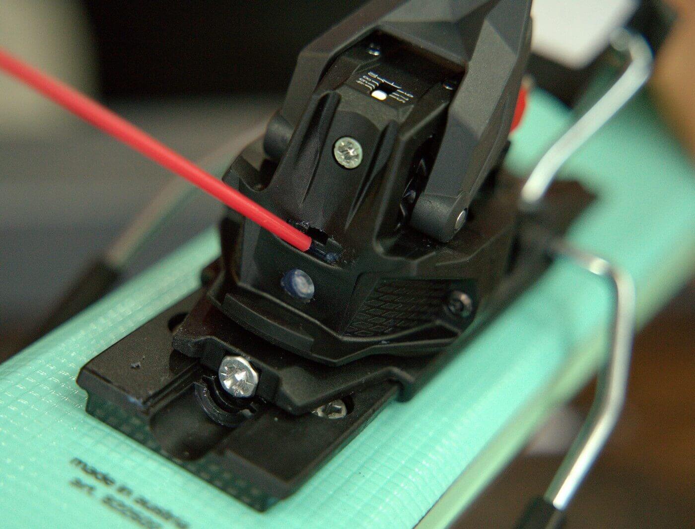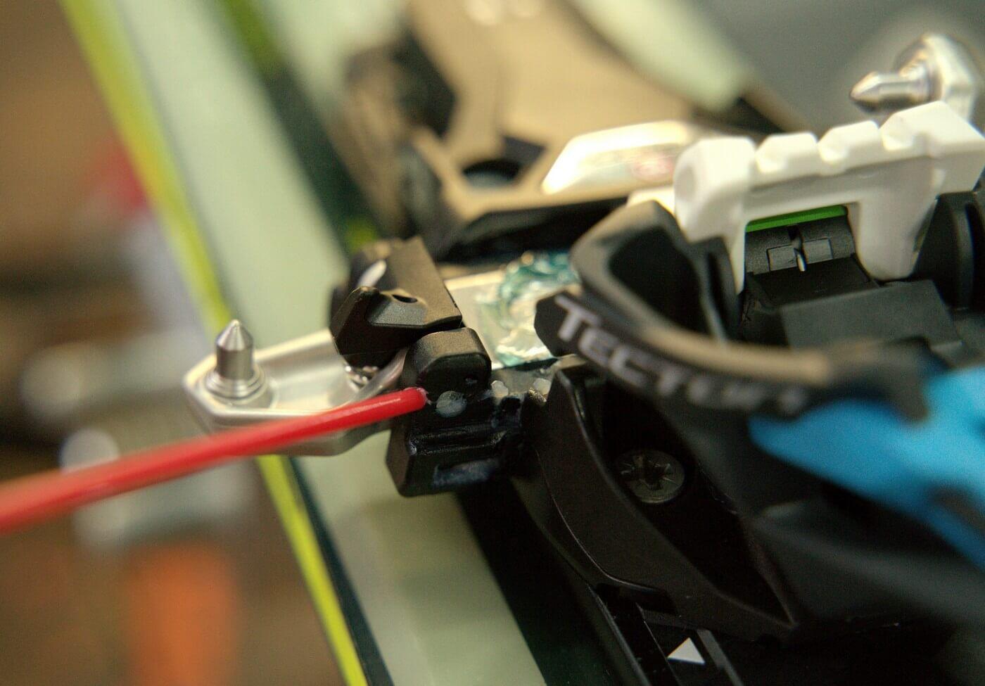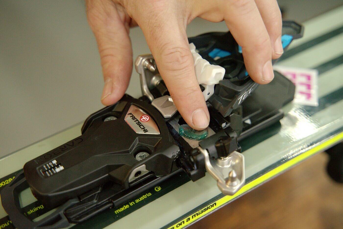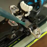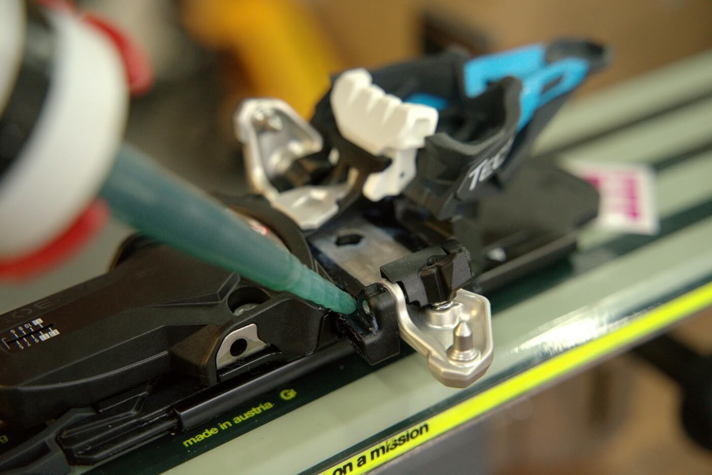 U špičky je důležité hladký chod čelistí s piny do stran. Nejlépe tekutou vazelínou ve spreji. Pro aplikaci z boku je dobré postavit lyže na bok, aby vazelína stekla na styčnou plochu. Další možností je stlačit prstem aretační páku, tím dojde k posuvu čelistí a v ten moment šplíchnout mazivo mezi plast a kov.