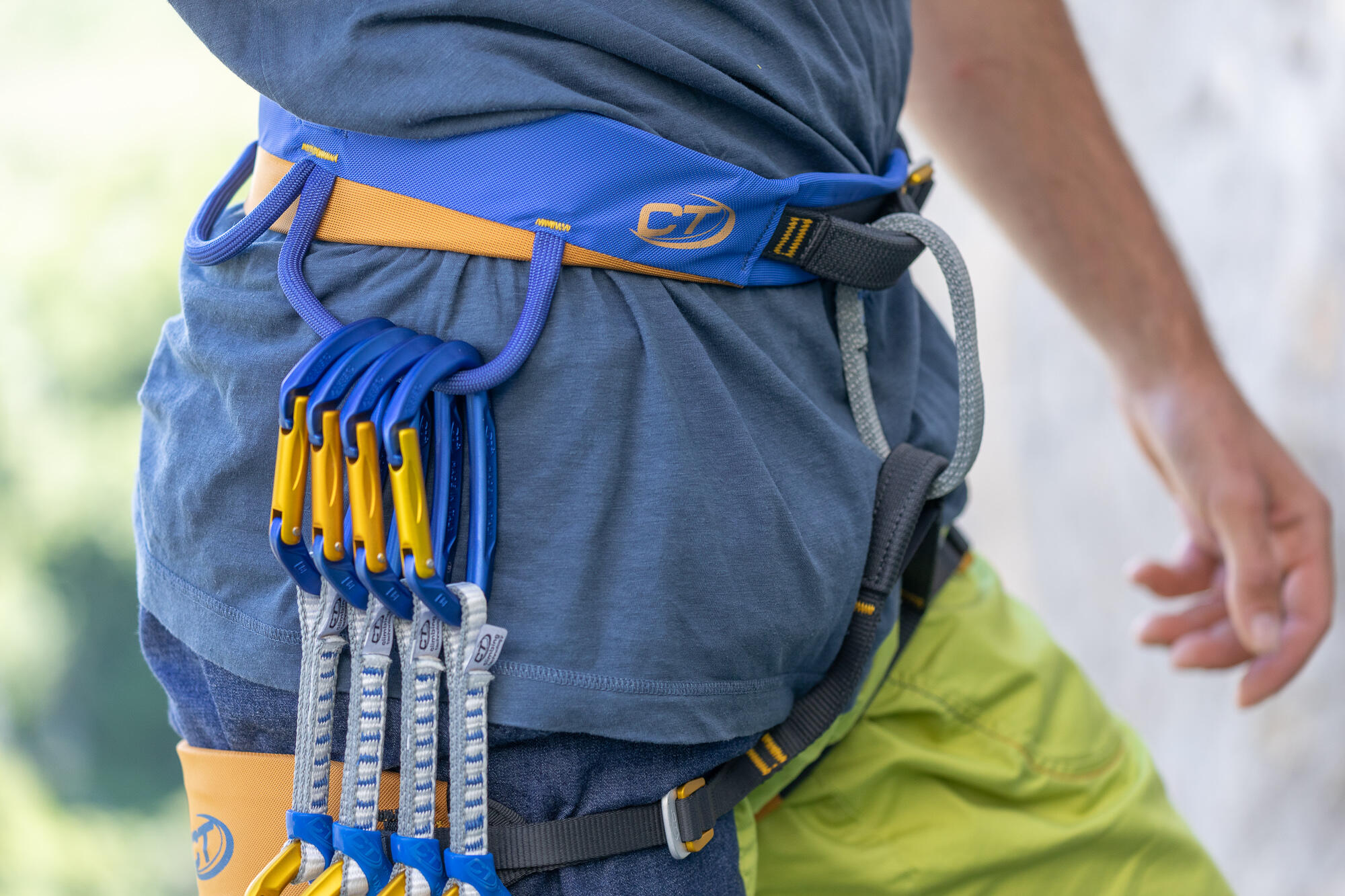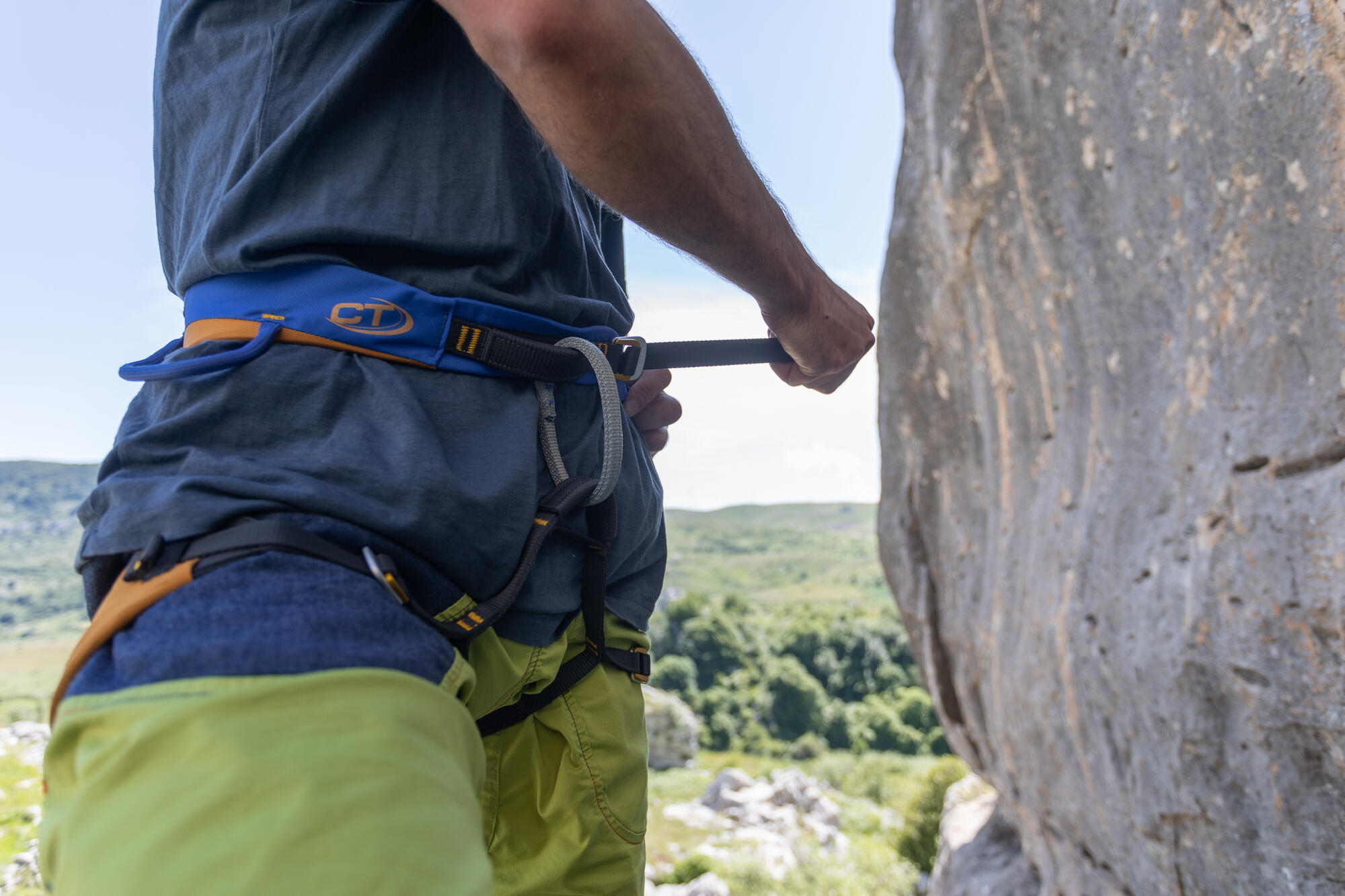 Navazujte se přes očka, která spojují opasek a nohavičky. Sešitá, uzavřená smyčka není primárně určená k navázání, slouží na zapnutí jistítka a při slaňování. Pozor na nepozornost a navázání do materiálového poutka.